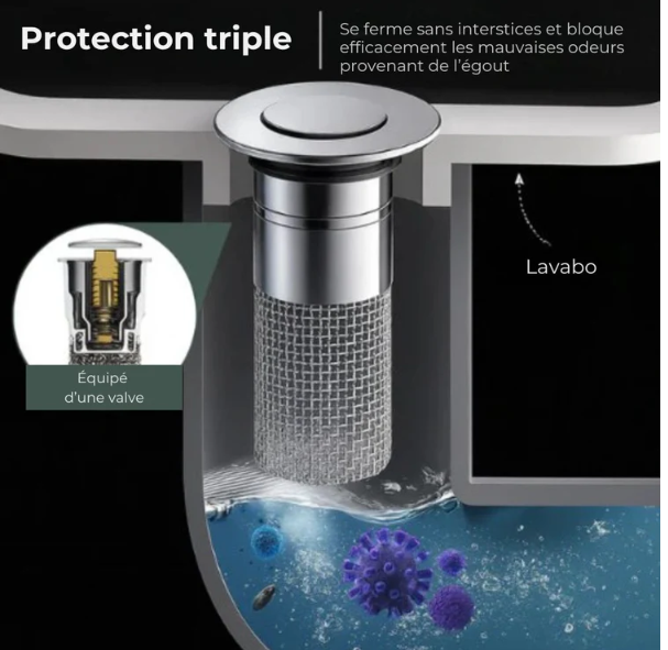 Ce bouchon de vidange nouvelle génération combine l'élégance d'un clapet ¨Puch¨ et l'efficacité d'un filtre récupérateur. Conçu pour s'adapter à la majorité des éviers et siphons, il s'installe en quelques secondes sans aucun outil.
